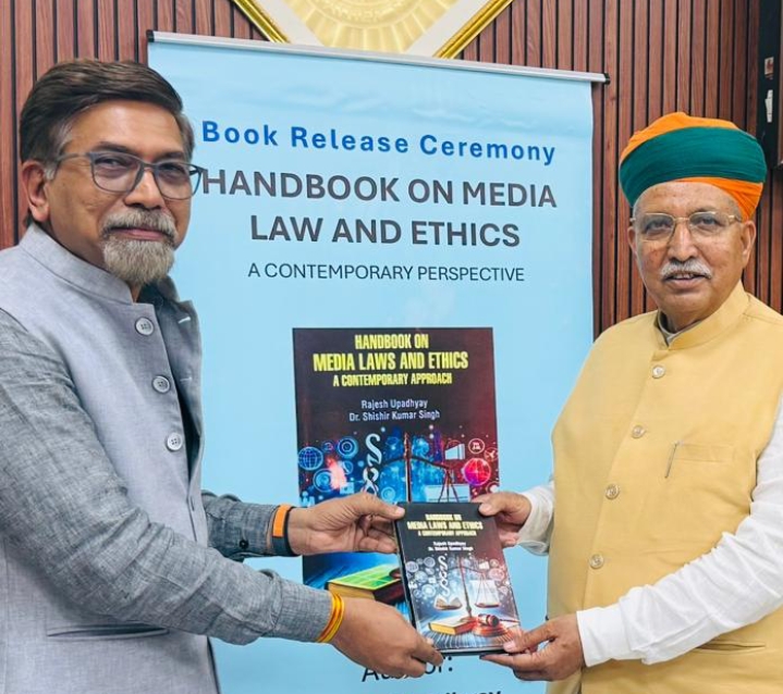 3 सितंबर, 2025 नई दिल्ली। केंद्रीय कानून एवं न्याय मंत्री अर्जुन राम मेघवाल ने राजधानी में ‘मीडिया कानून और नैतिकता’ नामक पुस्तक का विमोचन किया। यह किताब देश के वरिष्ठ पत्रकार राजेश उपाध्याय और डॉ. शिशिर कुमार सिंह द्वारा लिखी गई है। इस पुस्तक में एआई के जमाने में मीडिया के तेजी से बदलते स्वरूप और कानून के बारे में विस्तार से बताया गया है।