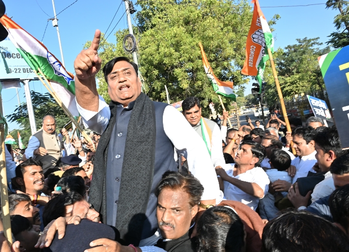 17 दिसंबर, 2025 जयपुर। भारतीय जनता पार्टी की केन्द्र सरकार द्वारा संवैधानिक संस्थाओं ईडी का दुरूपयोग कर विपक्ष के नेताओं को हेरान व परेशान किया गया, कांग्रेस पार्लियामेन्ट्री पार्टी की अध्यक्ष श्रीमती सोनिया गॉंधी व नेता विपक्ष लोकसभा राहुल गॉंधी को ईडी द्वारा भाजपा की केन्द्र सरकार के ईशारे पर राजनैतिक दुर्भावना और प्रतिशोध के आधार पर लम्बी पूछताछ एवं झूठे आरोप लगाकर लम्बे समय तक परेशान किया गया, जिसके विरोध में राजस्थान प्रदेश कांग्रेस कमेटी के अध्यक्ष गोविन्द सिंह डोटासरा के नेतृत्व में हजारों कार्यकर्ताओं ने प्रदेश की राजधानी जयपुर में भाजपा मुख्यालय का घेराव करने हेतु पैदल मार्च निकाल जबरदस्त विरोध-प्रदर्शन किया और गिरफ्तारी दी। प्रदर्शन में नेता प्रतिपक्ष टीकाराम जूली सहित कांग्रेस विधायक, विधायक प्रत्याशी, जिलाध्यक्ष, कांग्रेस के वरिष्ठ नेता व हजारों कार्यकर्ता शामिल हुये।