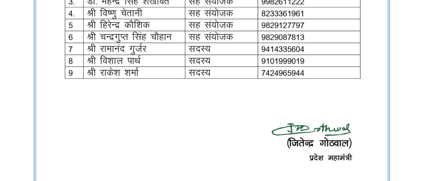 संयोजक – मनोज राजोरिया, सह संयोजक- महेंद्र कुमावत, महेंद्र सिंह शेखावत, विष्णु चेतानी, हिरेंद्र कौशिक एवं चंद्रगुप्त सिंह चौहान, सदस्य – रामानंद गुर्जर, विशाल पार्थ एवं राकेश शर्मा को अहम जिम्मेदारी सौंपी गई है।