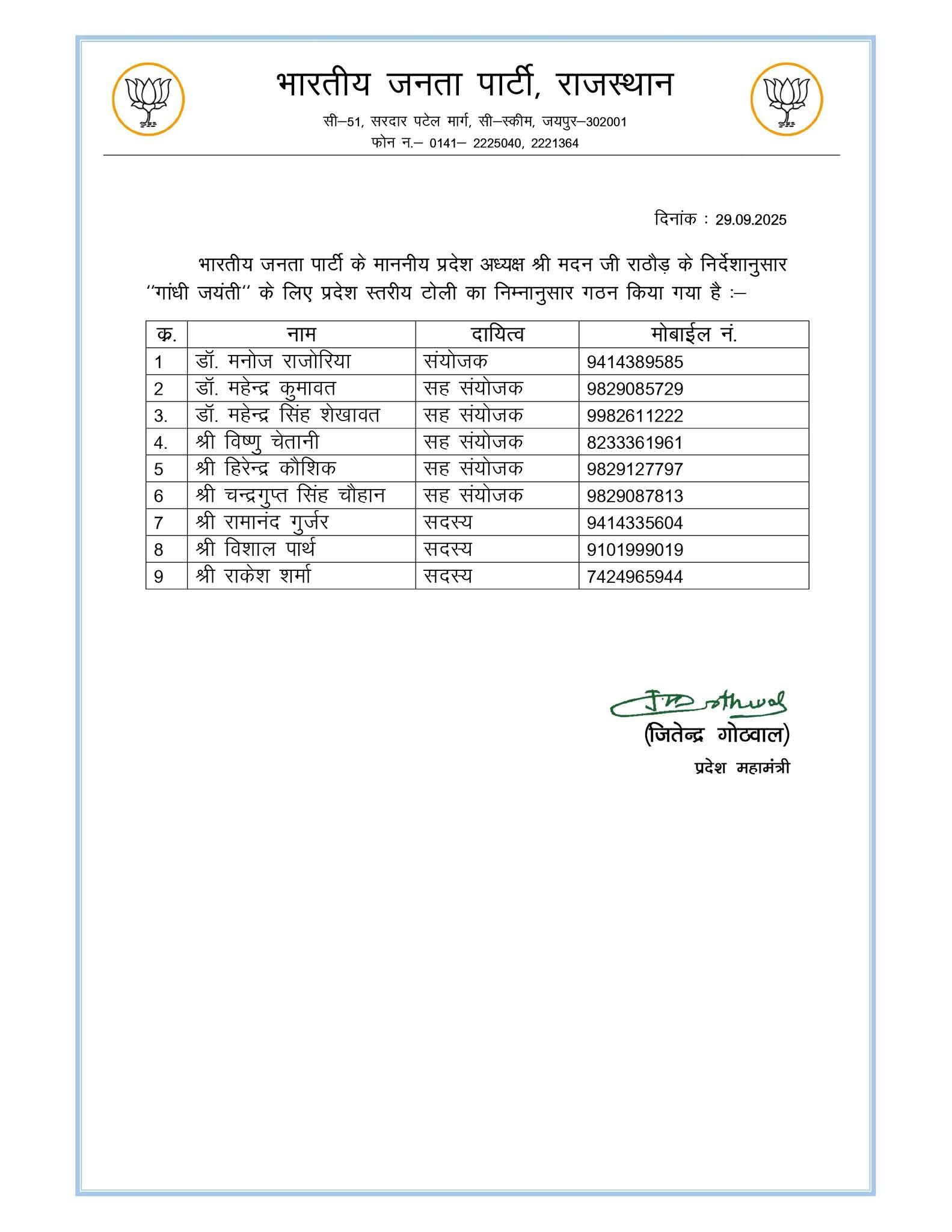 29 सितंबर, 2025 जयपुर। भारतीय जनता पार्टी राजस्थान द्वारा “गांधी जयंती” के लिए अपनी प्रदेश स्तरीय टोली का गठन किया। गौरतलब हैं कि राजस्थान प्रदेशाध्यक्ष मदन राठौर के निर्देशानुसार देर रात इस टोली का गठन किया गया हैं।