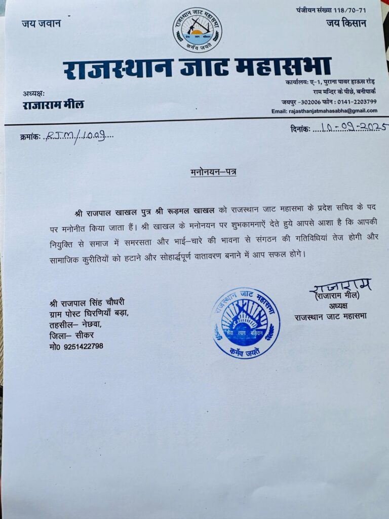 10 सितंबर, 2025 जयपुर। राजस्थान जाट महासभा के अध्यक्ष राजाराम मील ने राजपाल चौधरी को महासभा का नया प्रदेश सचिव मनोनीत किया। इस अवसर पर राजस्थान जाट महासभा के सभी प्रमुख प्रदेश कार्यकारिणी के पदाधिकारीगण जयपुर के प्रदेश मुख्यालय पर उपस्थित रहे।